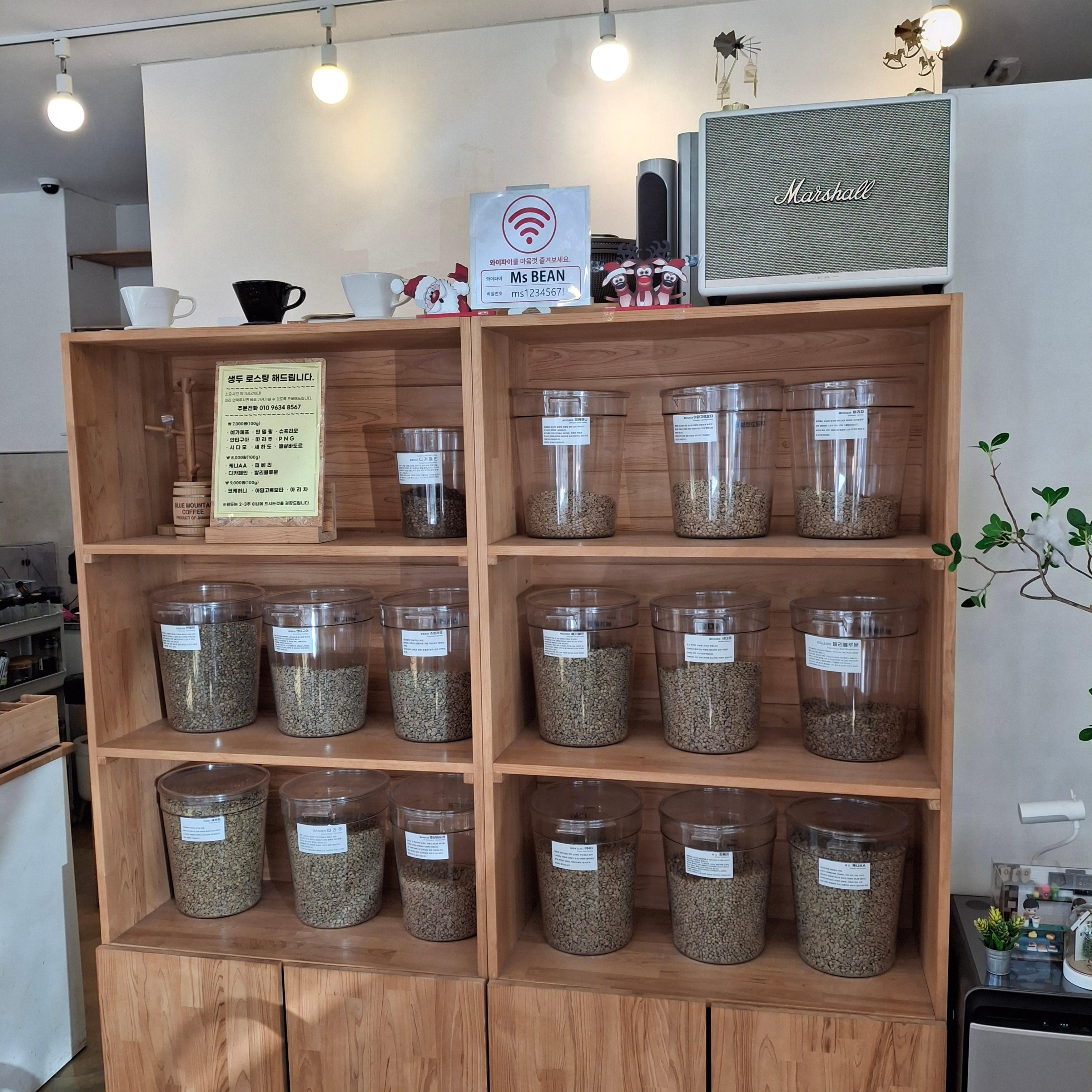 매장 한편에는 다양한 종류의 생두(Green Bean)가 진열되어 있습니다. 인테리어 효과도 있지만, 실제로 손님이 원두를 고르면 직접 로스팅까지 해주신다고 해요.